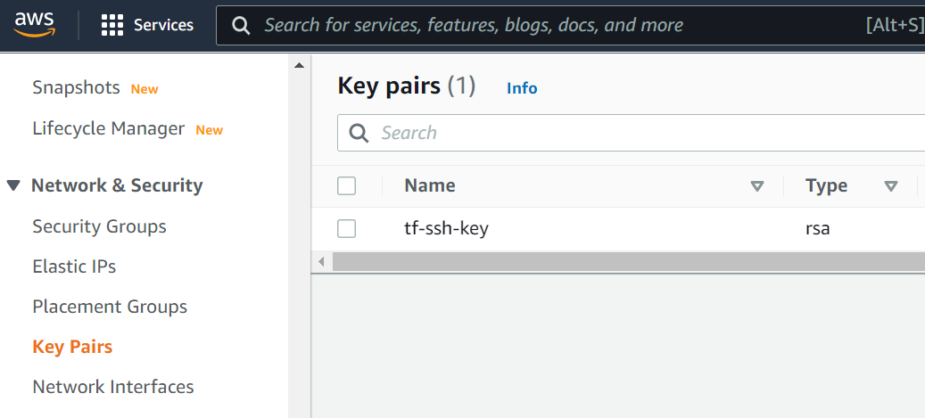 }运行terraform apply后就会看到在EC2 => Network & Security => Key Pairs中有自己刚创建的Key了。